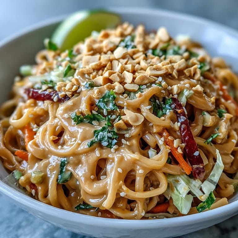 Save There's something almost meditative about the way a good peanut noodle bowl comes together—the soft clink of the whisk against the bowl as you're stirring up that creamy dressing, the steam rising off freshly cooked noodles, the bright snap of raw vegetables waiting to join the party. I stumbled onto this version during a particularly uninspired Tuesday evening when I had exactly what was in my pantry and nothing else to work with. What started as a lazy improvisation became something I find myself craving on overcast afternoons, when I want something that feels both nourishing and a little bit indulgent.