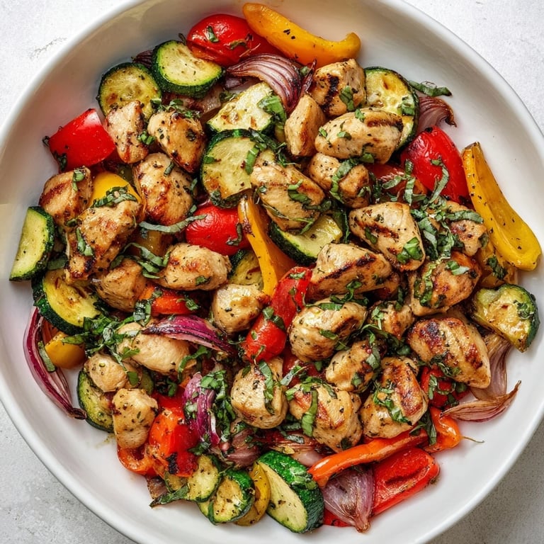Save A vibrant, herbaceous weeknight dinner featuring tender chicken and roasted vegetables, all bathed in a zesty basil-lemon marinade. Perfect for a simple, one-pan meal with minimal cleanup.