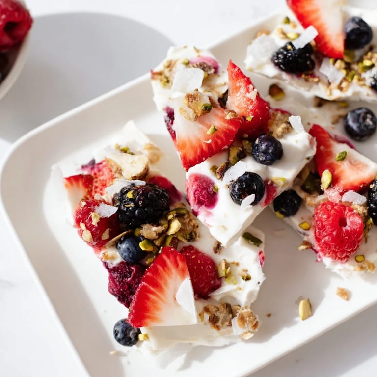 Save Summer mornings at my mom's place meant standing in her kitchen while she'd pull this out of the freezer, the berries suspended in creamy white like little jewels. I watched her crack off pieces and pop them in her mouth while coffee brewed, and I realized this wasn't just a snack—it was an answer to every time I craved something cold, sweet, and honest. The first time I made it myself, my kitchen smelled faintly of honey and fresh berries, and something about the simplicity made me wonder why I'd never thought of it before.