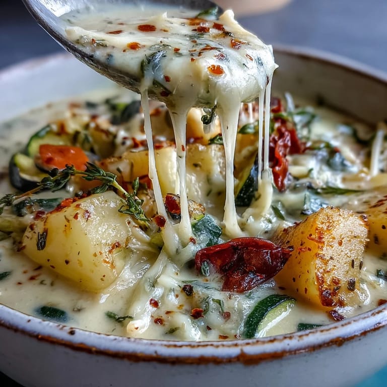 Save There's something magical about the moment when garlic hits hot butter and the whole kitchen fills with that unmistakable aroma. I was making this soup on a gray afternoon, not because I had a plan, but because my crisper drawer was overflowing and I wanted something warm that didn't rely on meat. What I ended up with was this creamy, cheese-forward vegetable soup that tastes like comfort itself, with that irresistible stretchy pull of melted mozzarella in every spoonful.