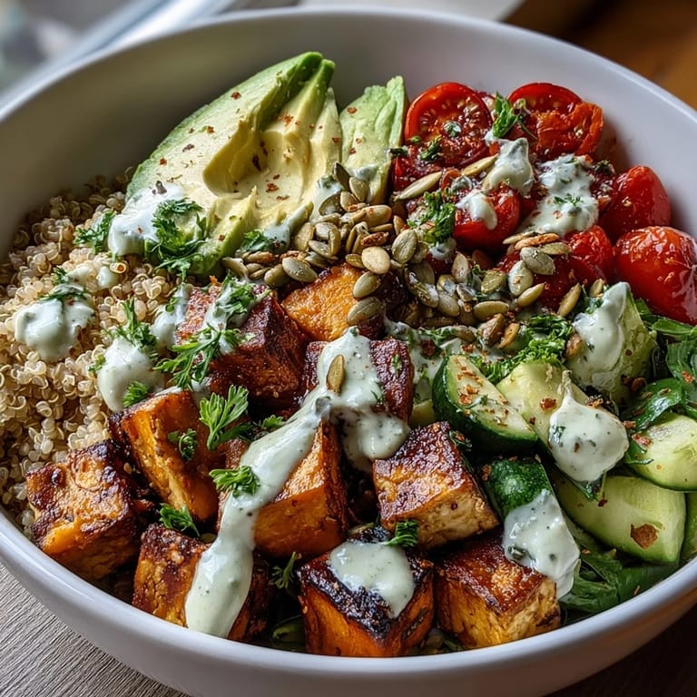 Combine raw and cooked elements for variety. Roasted sweet potatoes add sweetness, cherry tomatoes bring brightness, and cucumber offers crunch. Steamed broccoli provides substance, while shredded carrots contribute color. Creamy avocado ties everything together with rich texture.