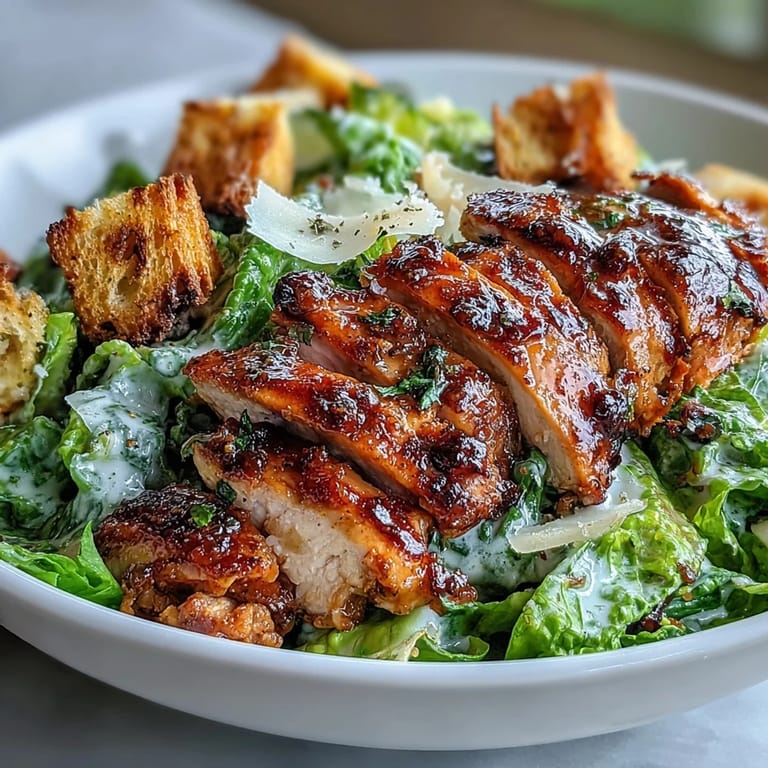 I served this to my sister during one of those rushed weeknight dinners when I needed something that looked intentional but wouldn't keep me in the kitchen all evening. She asked for the dressing recipe before finishing her plate, which meant everything was working. The way the warm chicken contrasts with the cool, crisp lettuce and those golden croutons catching the last bit of evening light, it felt like we'd slowed down somehow, even though the whole thing came together in barely half an hour.