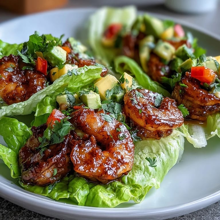 Place the butter lettuce leaves on a large serving platter and fill them generously with the spiced shrimp and fresh mango salsa. Top each taco with diced avocado and serve immediately with extra lime wedges on the side. This recipe yields 4 servings, making it an ideal light main dish for small gatherings.
