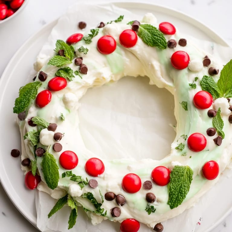 Save A festive, creamy dessert dip with fresh mint and chocolate chips, shaped into a cheerful holiday wreathβperfect for sharing at parties.