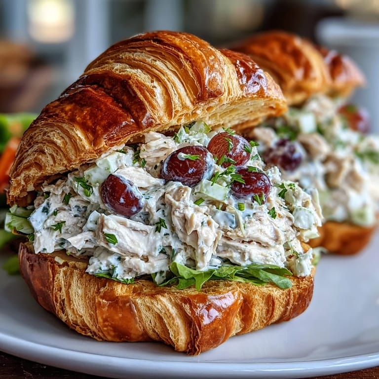 Save There's something about assembling a chicken salad sandwich that makes you feel like you've got your life together, even if you're eating it straight from a picnic blanket with the sun in your eyes. My neighbor handed me one of these croissant sandwiches at an impromptu backyard gathering last summer, and I was struck by how the grapes made the whole thing taste both familiar and surprising at once. The buttery croissant practically melted against the creamy filling, and I found myself asking for the recipe before I'd even finished my first bite. What I loved most was how simple it felt to make, yet how elegant it tasted—the kind of sandwich that makes people think you've spent hours in the kitchen when really you just know a few good tricks.
