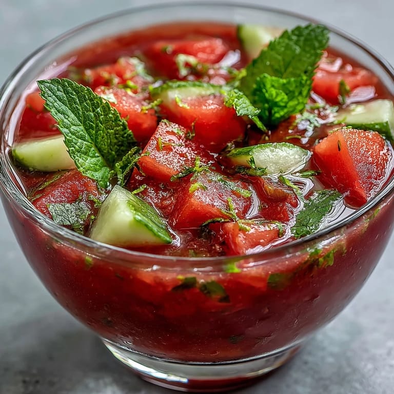 Save There's something about that first sip of gazpacho that makes you feel like you've outsmarted the summer heat. My neighbor handed me a bowl of this watermelon mint situation on a sweltering afternoon, and I was genuinely skeptical—watermelon in a soup seemed chaotic. But one taste and I understood why she'd been making it all season. The sweetness doesn't overpower; instead, it dances with the lime and mint, creating something that tastes like a perfectly cold exhale.