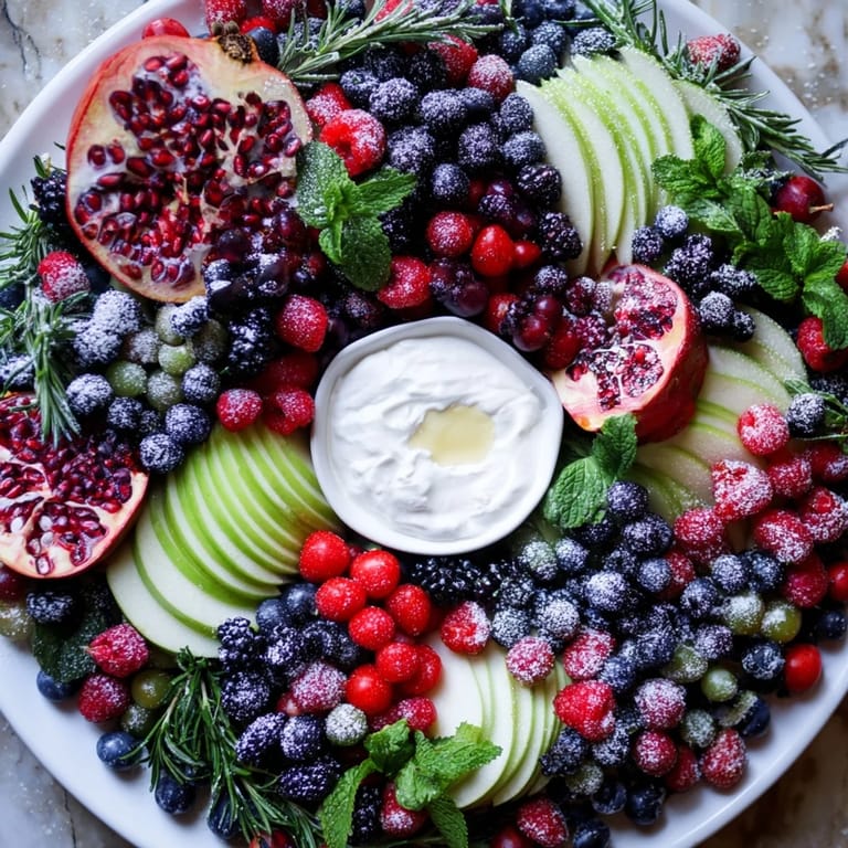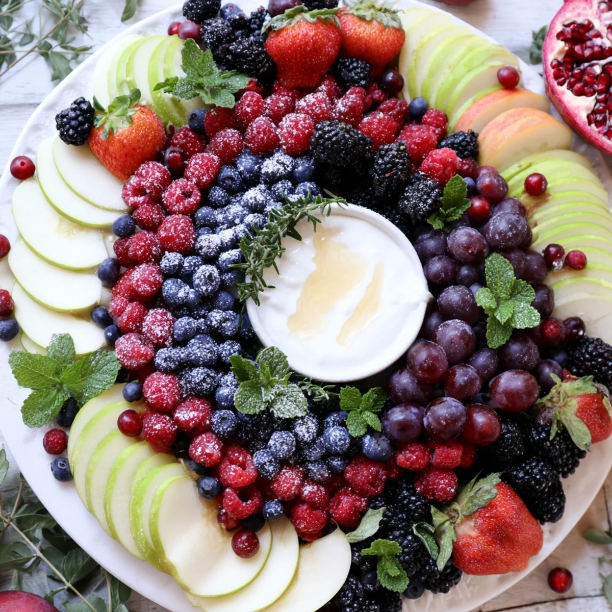 - Fresh Winter Fruits: 2 cups fresh cranberries (for garnish, not for eating raw), 1 cup red seedless grapes, halved, 1 cup green seedless grapes, halved, 1 cup blackberries, 1 cup blueberries, 1 cup raspberries, 1 cup pomegranate arils, 2 kiwi peeled and sliced into rounds, 1 apple thinly sliced, 1 pear thinly sliced